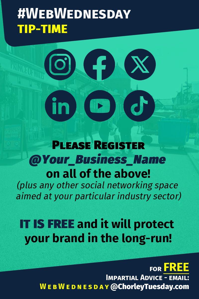 Simply just @ChorleyTuesday on our Instagram, Facebook page, X/Twitter, LinkedIn (company page) or TikTok using the hashtag #WebWednesday or even email: WebWednesday@ChorleyTuesday.net, with your query and we will do our very best to help you during Wednesday afternoons!